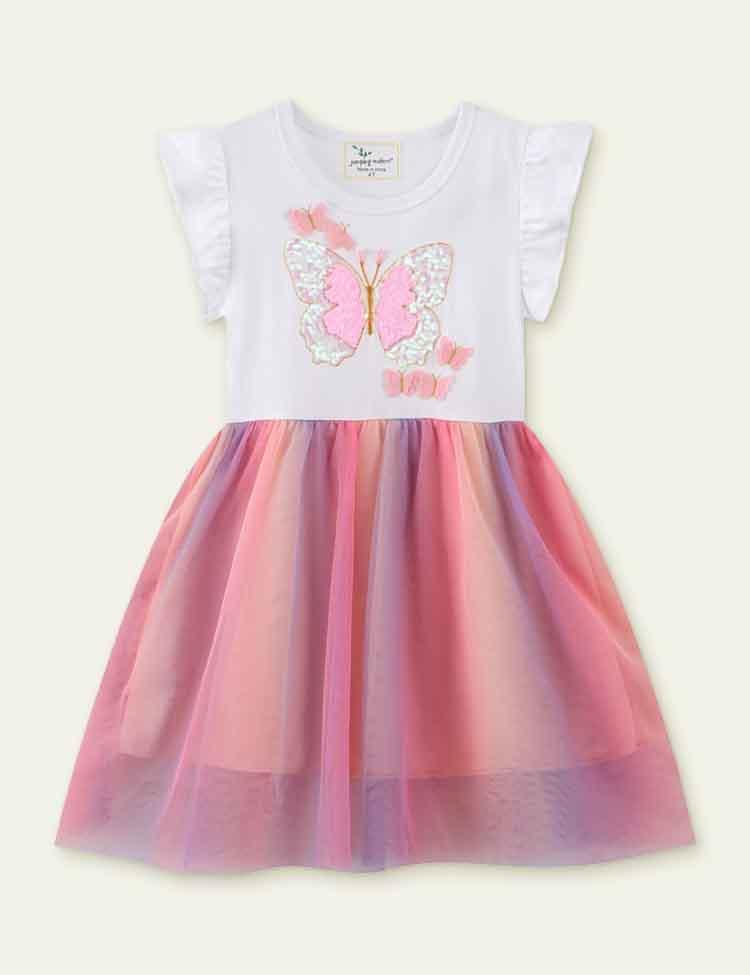 Toddler Girl Butterfly Sequined Flutter Sleeves Splicing Rainbow Mesh Dress