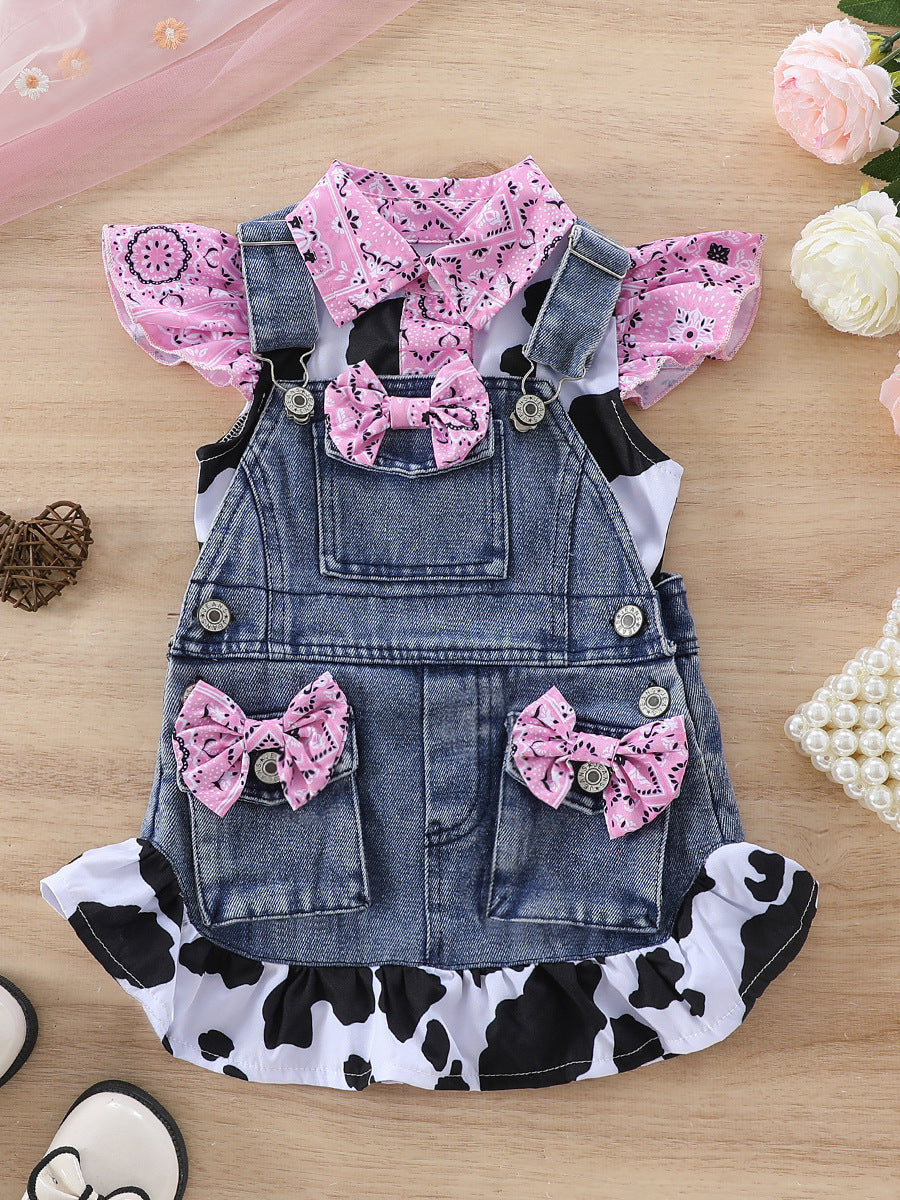 Cow Print Shirt Top + Bow Denim Suspender Shorts