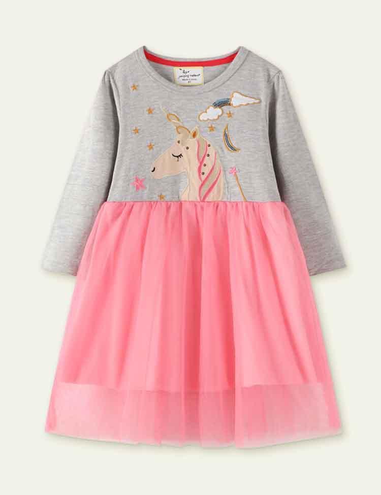 Toddler Girl Unicorn Embroidered Long Sleeves Mesh Splice Dress