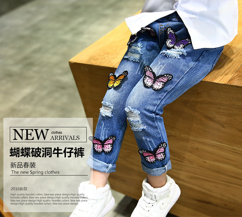 Children's Clothing Girls' Spring and Autumn Jeans Butterfly Ripped Baby Denim Trousers