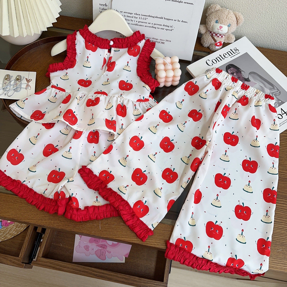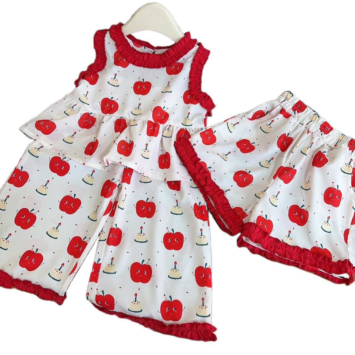 Cartoon Apple Printed Top-+ Shorts + Trousers Three-Piece Set