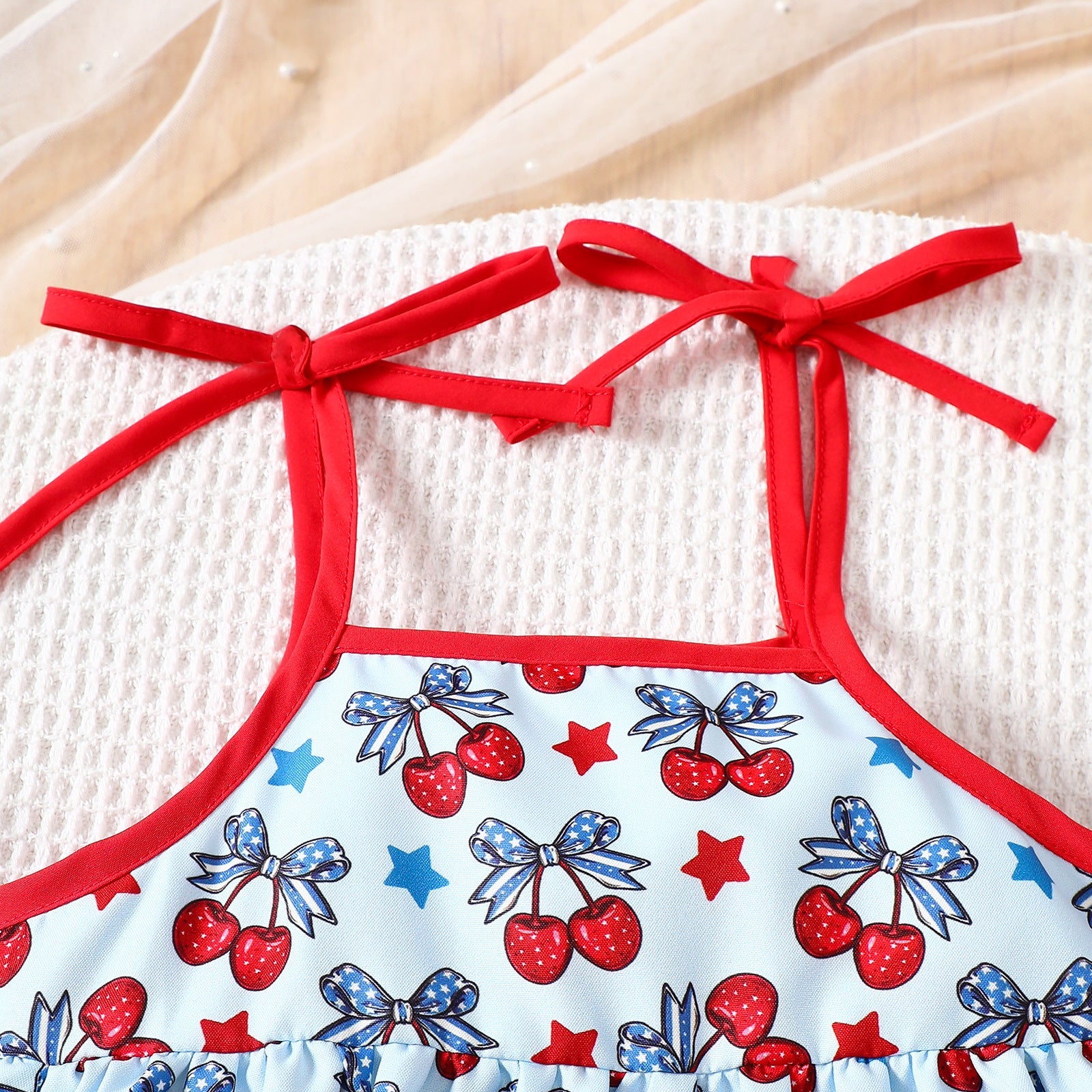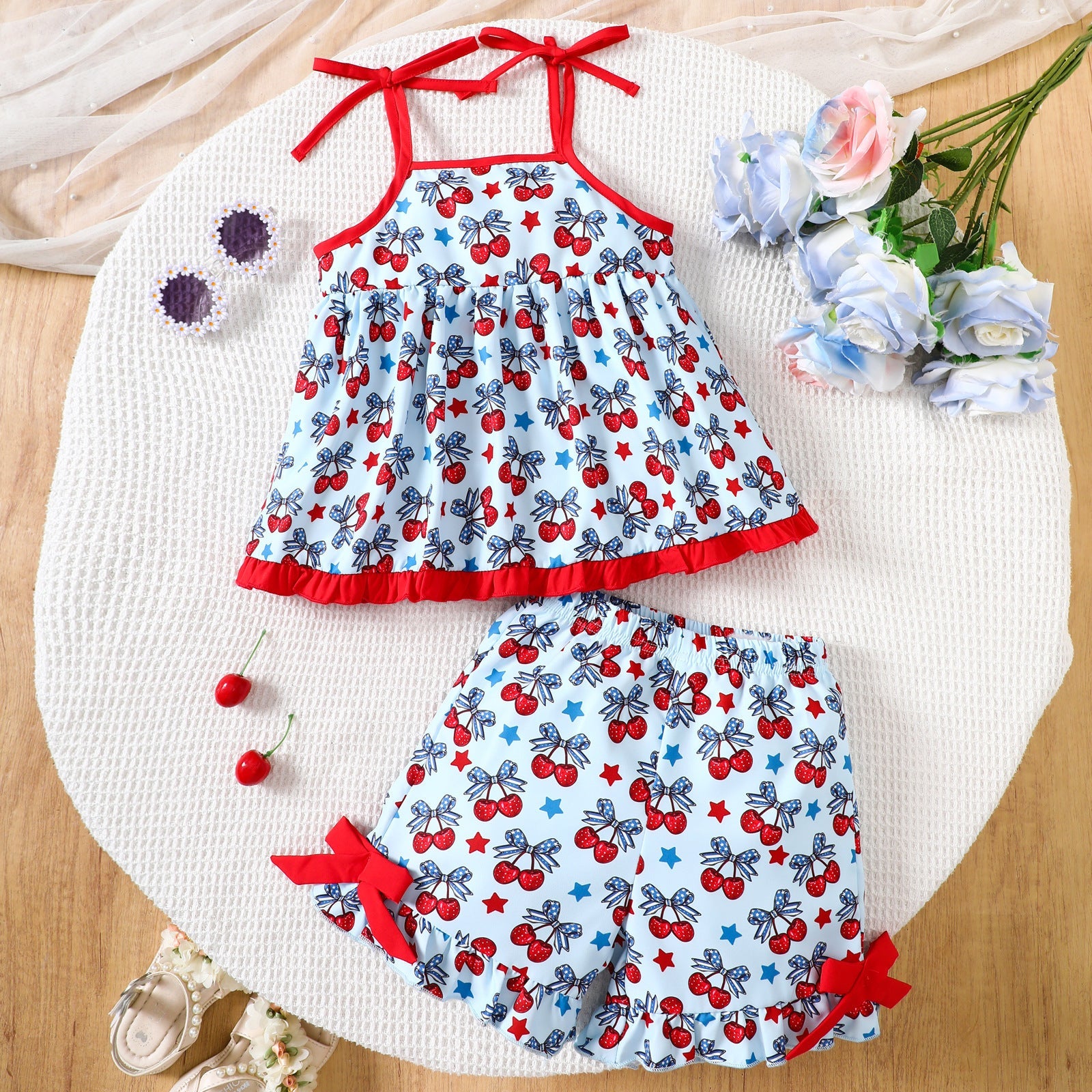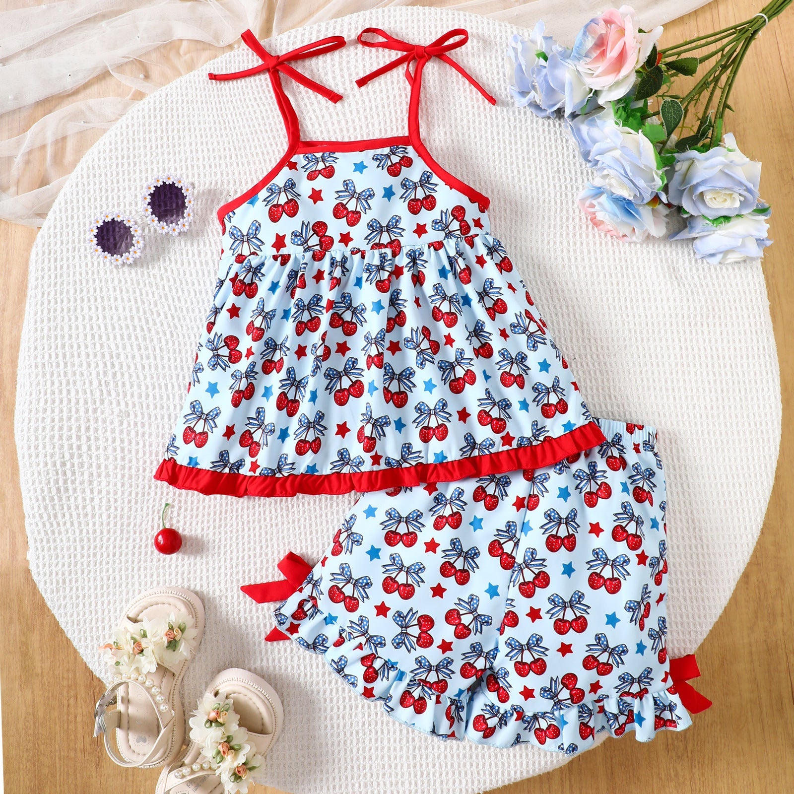 Cherry Printed Suspender Top + Lace Shorts Two-Piece Set