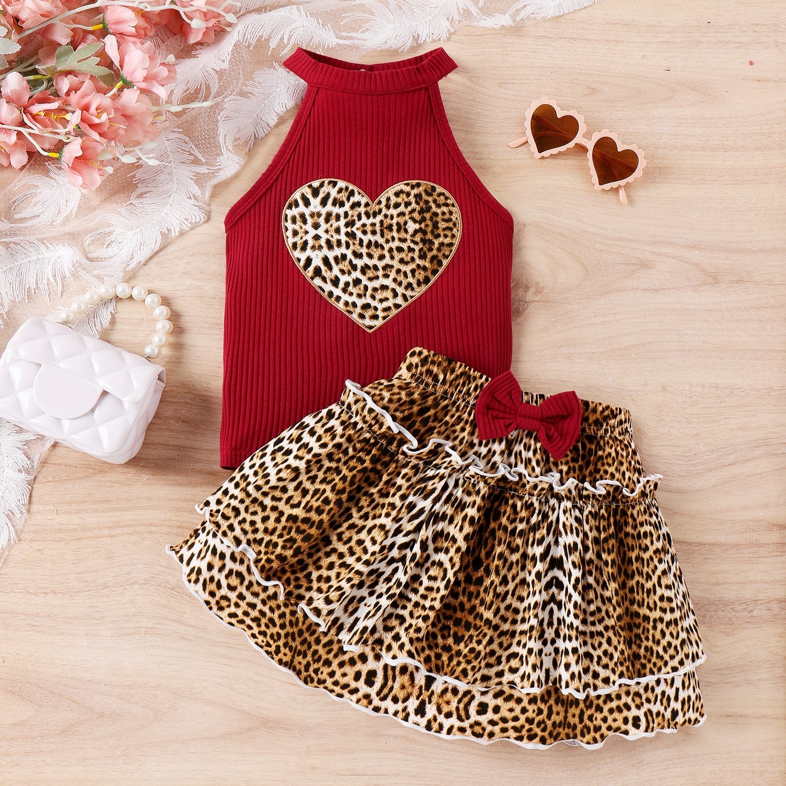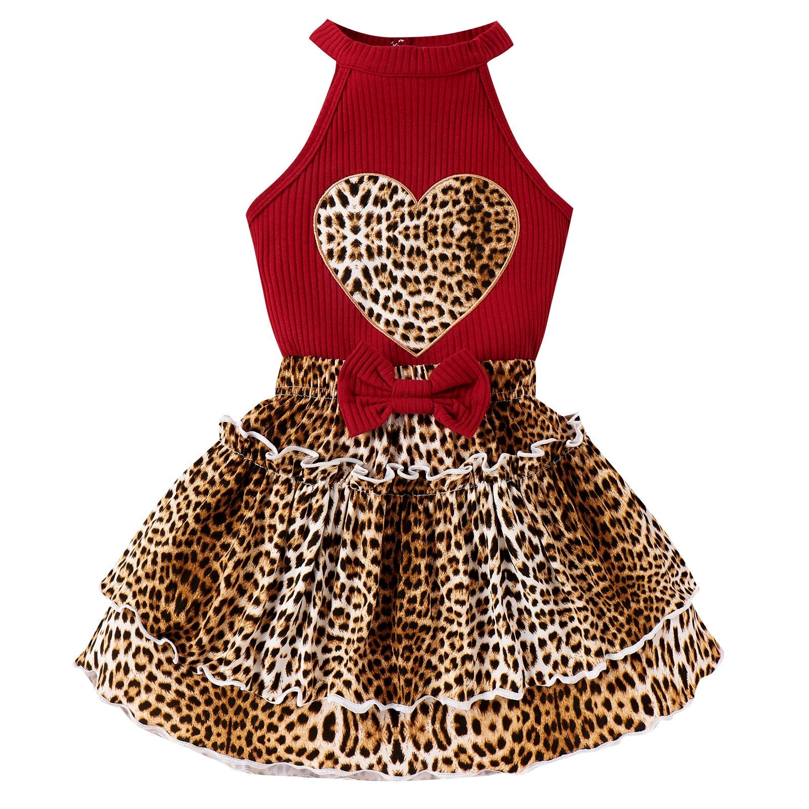 Heart Leopard Print Halter Top + Leopard Print Cake Skirt Set