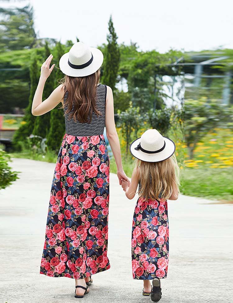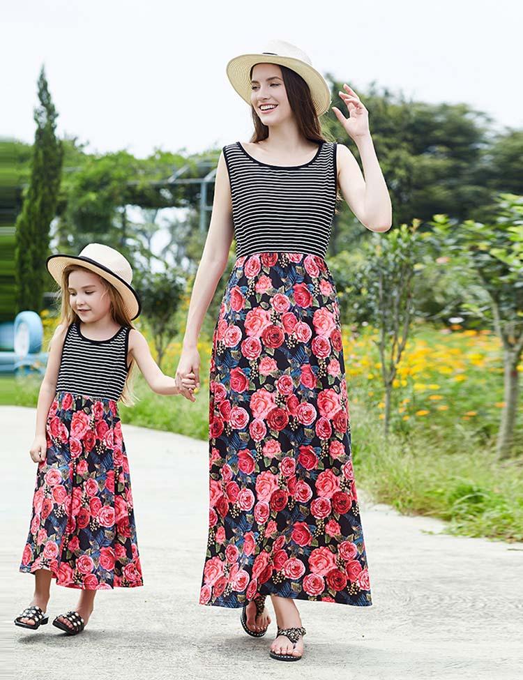 Family Matching Floral Print Splice Stripe Sleeveless Dresses Sets