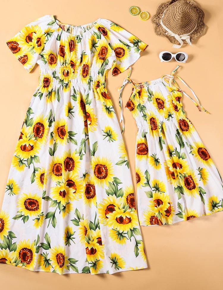 2Pcs Family Matching Sunflower Short Sleeves Midi Dress Sets